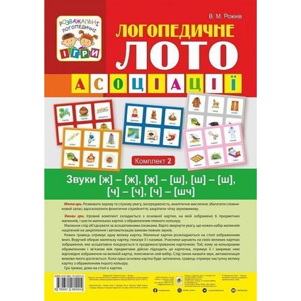 Ігри та мовні завдання, розроблені логопедом, допоможуть виявити й виправити у дітей недоліки вимови окремих звуків, збагатити словниковий запас, розвинути зв’язне мовлення. У процесі гри розвиваються сприймання, пам’ять, увага, мислення, навички узагальнення і класифікації, спілкування. Логопедичне лото «Асоціації» знадобиться логопедам, психологам, педагогам і дбайливим батькам у роботі з дітьми.