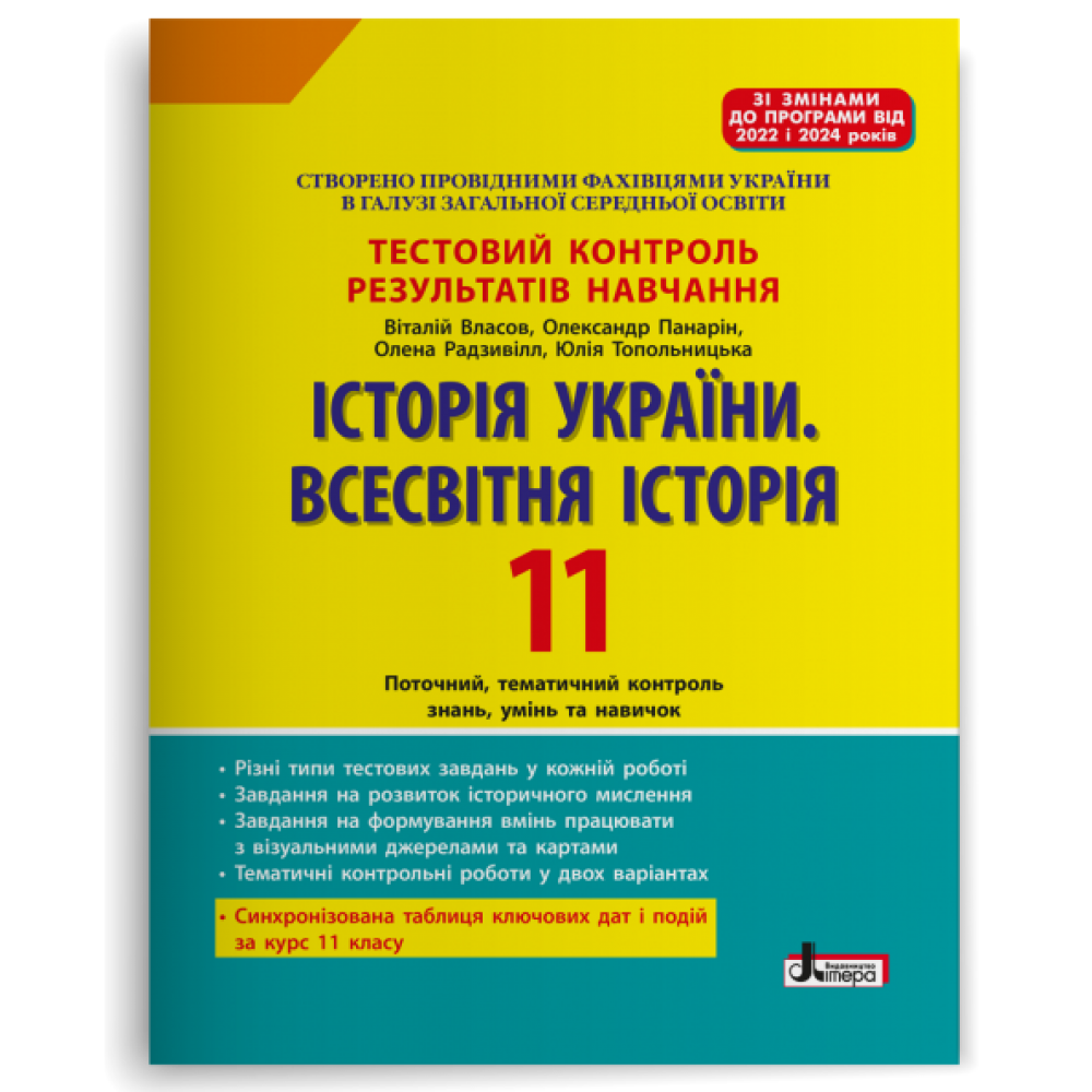 Зошит тестового контролю результатів навчання для 11 класу відповідає чинній програмі з історії України та всесвітньої історії для 11 класу.Посібник призначений для перевірки засвоєння навчального матеріалу та оцінювання навчальних досягнень учнів. Учні виконують завдання безпосередньо в зошиті. За наявності часу відповіді можна переносити на окремі аркуші або бланки. Це дасть змогу вчителеві інтенсифікувати процес перевірки та оцінювання. Зошит містить по два варіанти завдань для проведення т