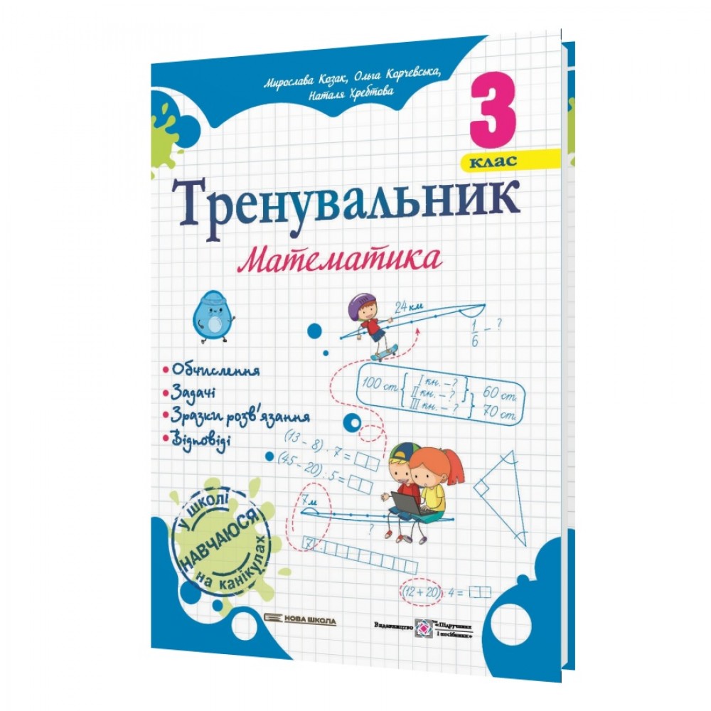 Мета посібників «Тренувальник з математики» — удосконалити обчислювальні навички учнів та їх уміння розвʼязувати рівняння і задачі.Доступні пояснення, зразки розвʼязання та вкладка-відповіді до всіх завдань — це те, що неодмінно допоможе в навчанні онлайн та на канікулах.Посібник містить завдання з математики, виконання яких допоможе третьокласникам удосконалити обчислювальні навички та закріпити вміння розвʼязувати програмові задачі.До всіх вправ додаються відповіді, призначені вчителю