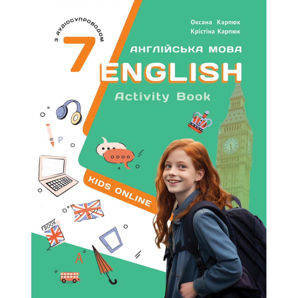 Робочий зошит з англійської мови для 7-го класу інтегровано в НМК “English 7. Kids Online” авторів О. Карпюк, К. Карпюк. У виданні міститься навчальний інструментарій для кращого засвоєння мовного і мовленнєвого матеріалу підручника.Робочий зошит містить аудіосупровід, який є у вільному доступі на сайті видавництва, та ключ-код для завантаження інтерактивної мультимедійної програми.